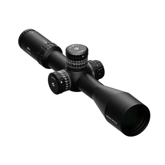 ARKEN OPTICS products are designed to combine quality, performance, and precision with tremendous value. The EP-5 is a FFP (First Focal Plane) optic that features Japanese ED glass to enhance clarity and minimize dispersion. The center dot and the immediate 1 MIL (4 MOA) area surrounding the reticle can be illuminated red, enhancing visibility and focus. Additionally, it is outfitted with our AZS system (ARKEN ZERO Stop) and incorporates adjustable elevation and windage turrets with tactile and audible clicks. These turrets are 10 MIL/25 MOA per revolution.