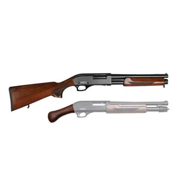 This particular model sports a 14" barrel. It feels very handy and points extremely naturally. With a capacity of 4+1 2-3/4 12 Gauge shotgun shells make this one great range toy or bush gun. This combo deal comes with both a fixed stock and a bird head grip.